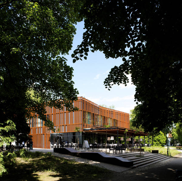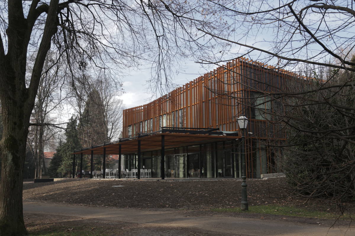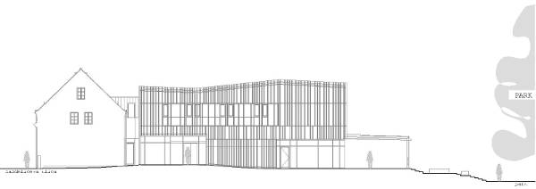 Predloženi volumen dogradnje paviljona, nepravilno ukošenih stranica, sa izlomljenim plohama višestrešnog krovišta proizlazi iz gradske matrice, guste mreže varaždinskih kuća u povijesnoj jezgri. Paviljon se „kopčom“ veže na uličnu prizemnicu. Vanjska ovojnica paviljona je propusna opna od vertikala u cor-tenu, kao rešetka omata sva pročelja. Igra svjetlosti i sjene vertikala, crveno smeđi titrajući tonovi preko crne ovojnice su glavne karakteristike oblikovanja paviljona. Svojom pojavnošću, primjerenim i skladnim volumenom, objekt hotela daje novu točku prepoznatljivosti unutar jezgre grada.
