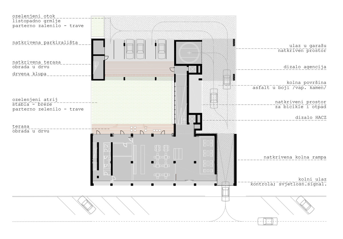Prostor u prizemlju se u potpunosti otvara, saglediv je iz ulice, prezentiraju se specifični elementi tipologije gradnje. Naglašeno je sagledavanje prostora prizemlja iz uličnih vizura, pogled se kroz staklene opne pruža do ozelenjenog atrija u dvorištu.